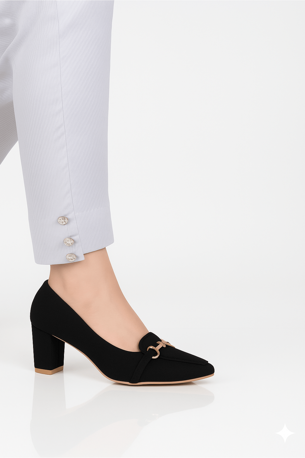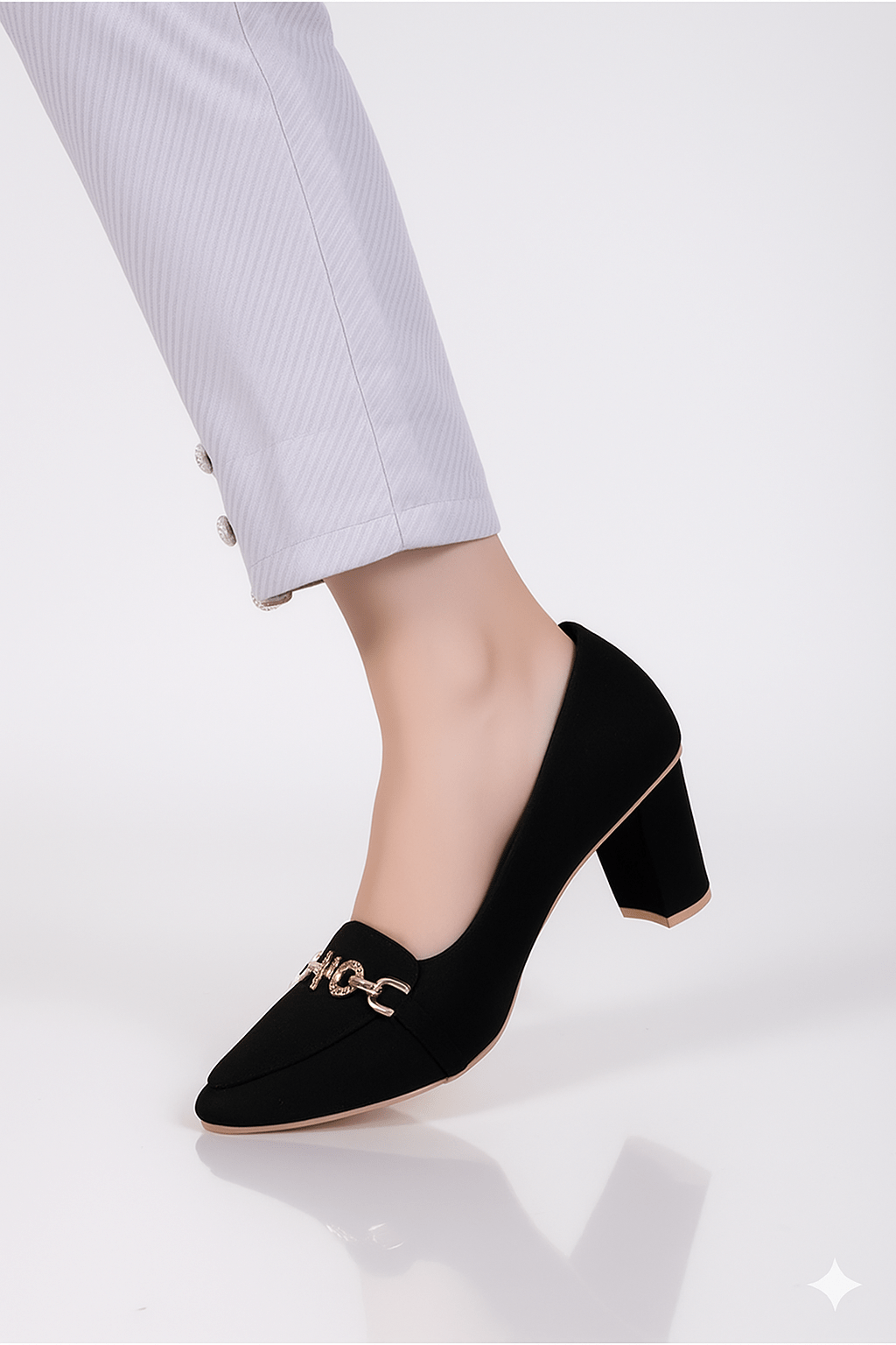 Make a bold statement with our black heels, exuding noir elegance. Featuring a sleek design with a stylish buckle, they're perfect for formal events or a night out. Pair them with any outfit for a classic, sophisticated look.